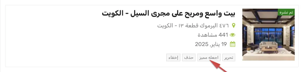 إعلانك مميز وصار جاهزا للظهور بشكل أكبر. اجعله مميز وبذلك يظهر بألوان ملفتة وكذلك في أعلى القائمة. إنها طريقة جميلة للفت الانتباه أكثر، اذ يتكرر ظهور عقارك في الواجهة وفي عمليات البحث فلا تخطئه العين