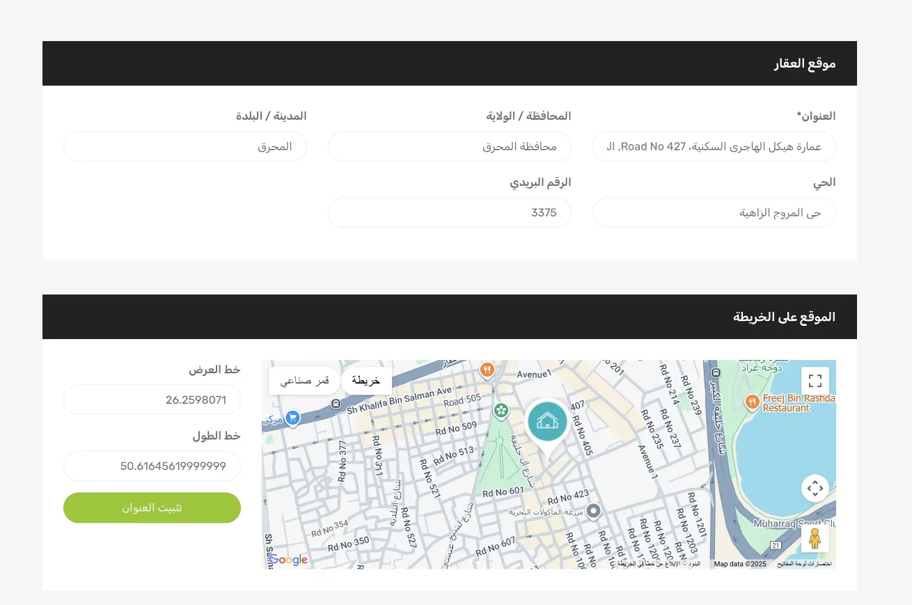 مزايا العقار واضحة وقد تزيد من رغبة الزبون في عقد صفقة. ادخل العنوان في حقل البحث وفي الغالب سيتعرف عليه محرك البحث إن كان في المناطق المنظمة أو المهمة والا فيمكنك كتابة العنوان ومن ثم تحديد المكان بالضبط عن طريق الخريطة ثم النقر على زر تثبيت العنوان. هذا يساعد المشتري على الوصول للعنوان ومعاينة الموقع قبل الإتصال بك. بالنسبة للشقق لا تحتاج الى كتابة رقم الشقة فيمكن الإكتفاء برقم العمارة. وفرنا لك خريطة تساعد المشترى على معرفة الخدمات الحيوية القريبة من العقار