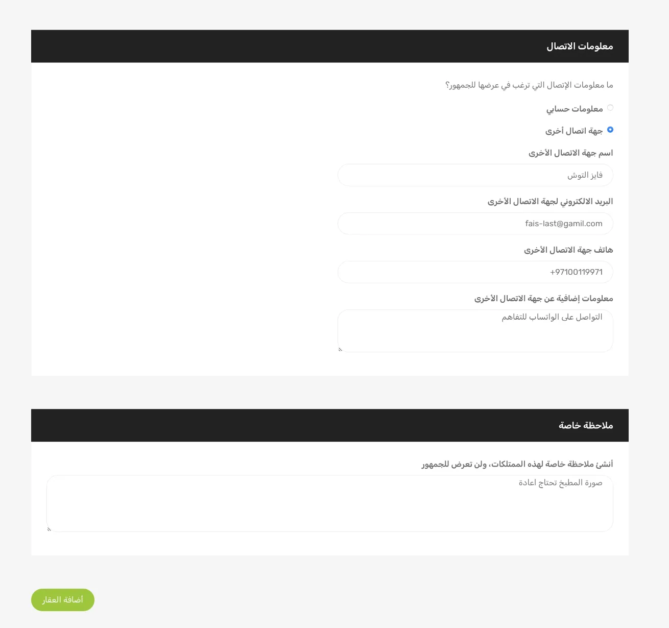 وأخيرا معلومات الإتصال ومن ثم النقر على زر إضافة العقار